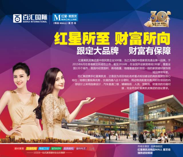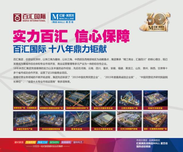 2016年12月15日,中国家居流通业第一品牌红星美凯龙与百汇集团正式达成品牌合作联盟企业,继12月15日红星美凯龙星艺佳成功入驻柘城万洋商贸城后,19日再度携手百汇集团,入驻百汇国际·红星美凯龙星艺佳项目,打造铜梁“建材家居商贸航母”。